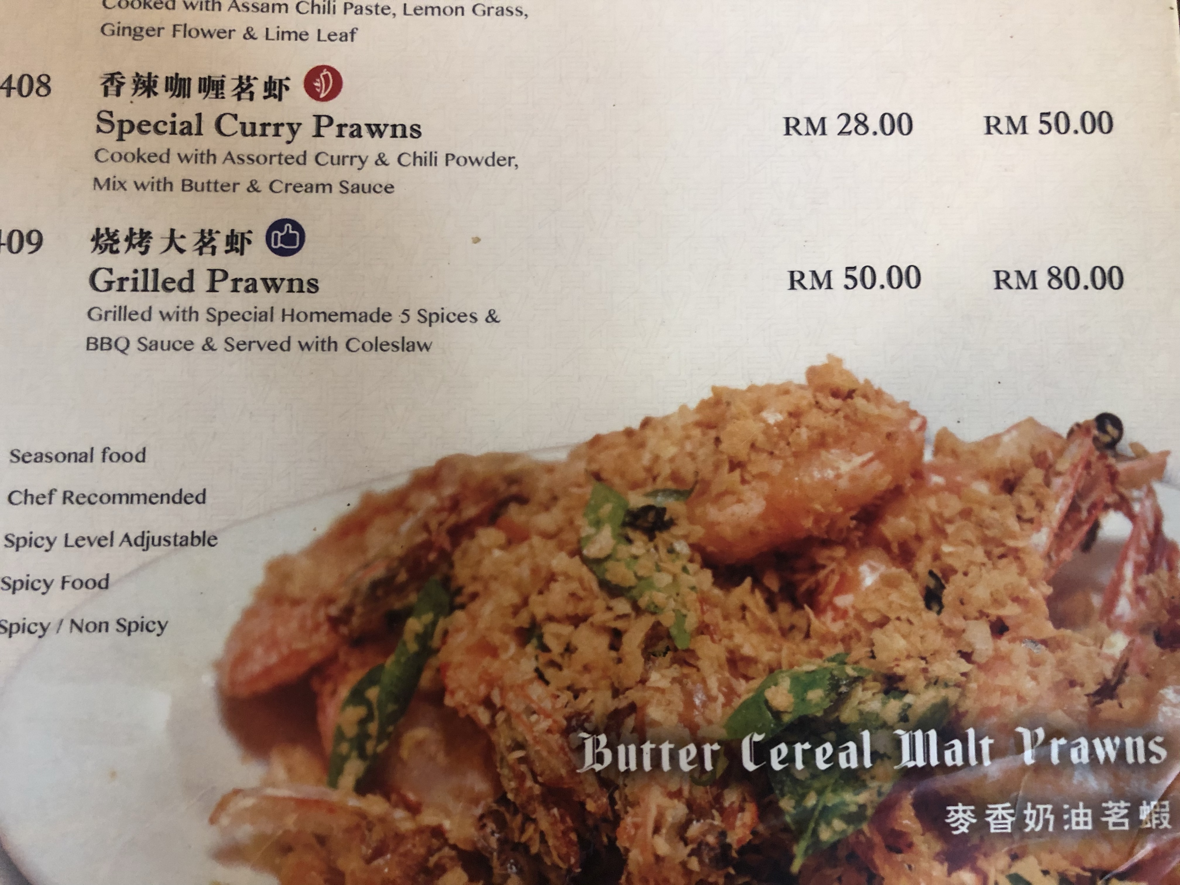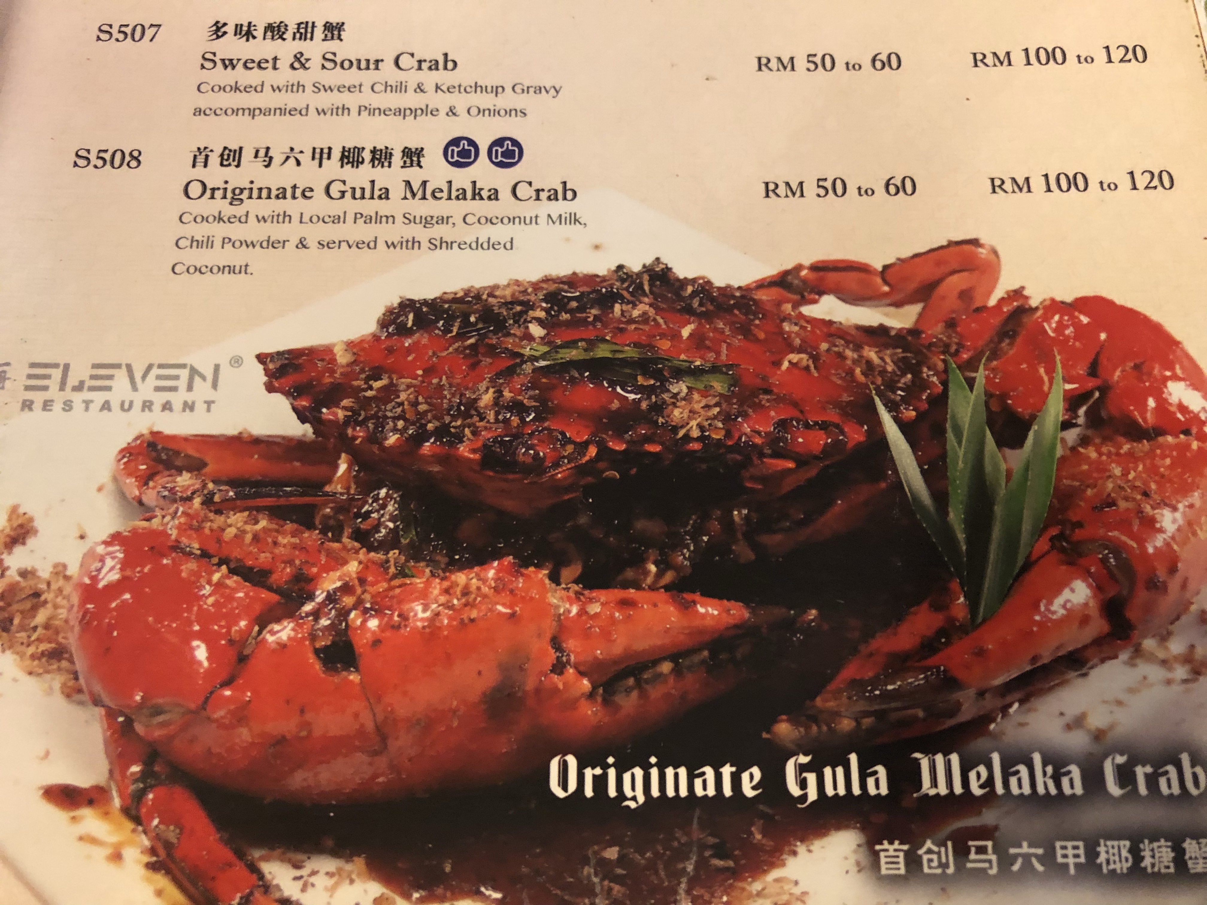 직원은 멜라카 크랩을 추천했고... 보다시피 메뉴판에도 엄지 손가락이 두 개나 있었다.