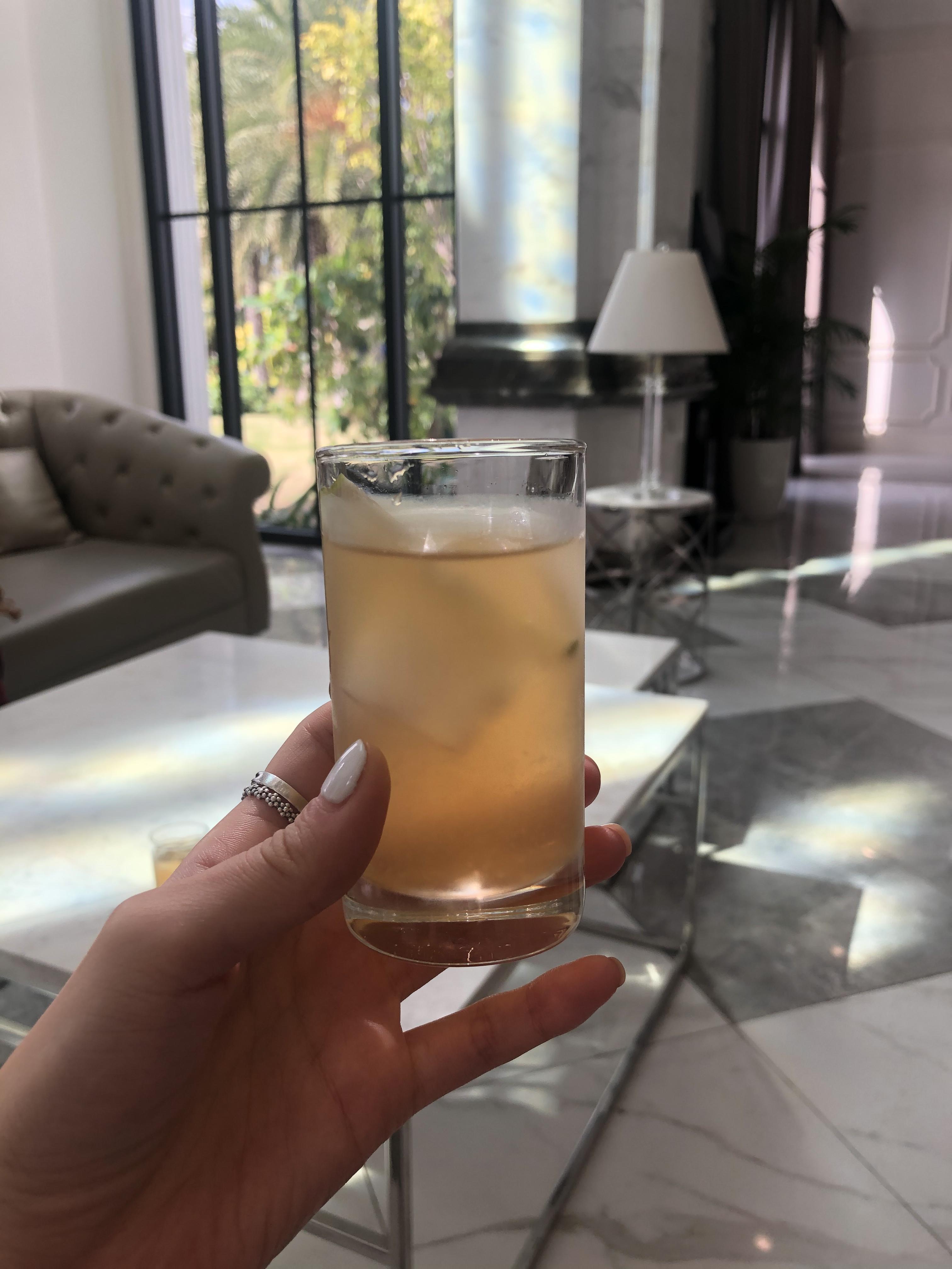쇼파에 앉아서 몸을 눕히고 기다리고 있었는데, 호텔 직원이 와서 웰컴 드링크를 줬다.