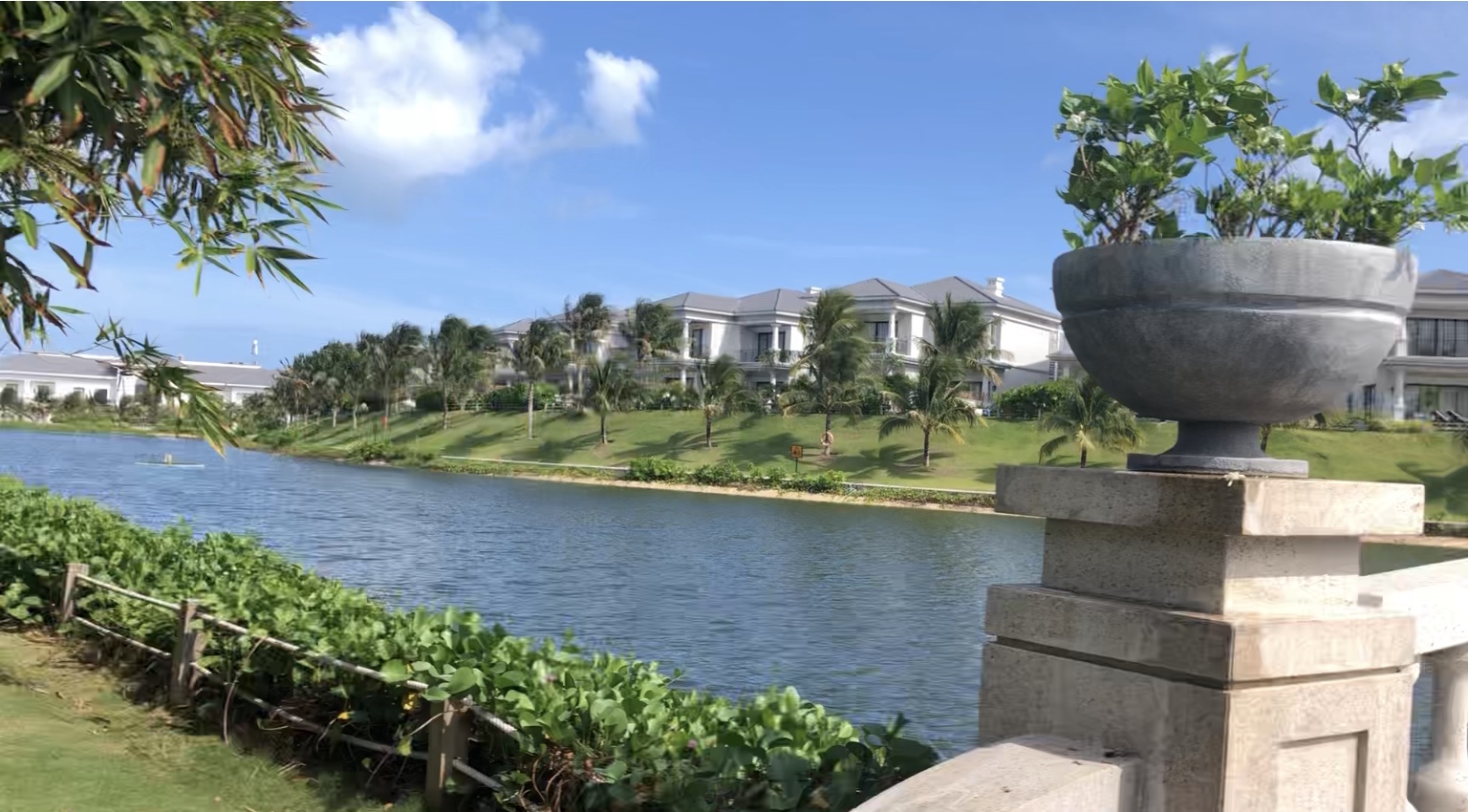 툭툭이로 이렇게 강도 건너서 유닛으로 이동! 이렇게 중간에 가로지르는 강이 있을 정도로 빈펄 리조트 내부가 굉장히 크다. 강 건너에도 똑같이 생긴 유닛들이 줄지어 있었다.