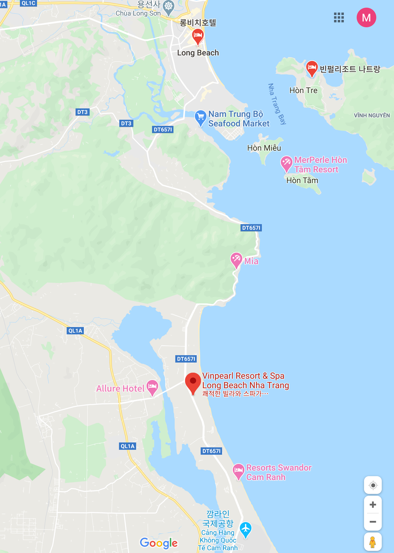 지도에서 볼 수 있듯이 거의 나트랑 국제공항 근처에 있다.