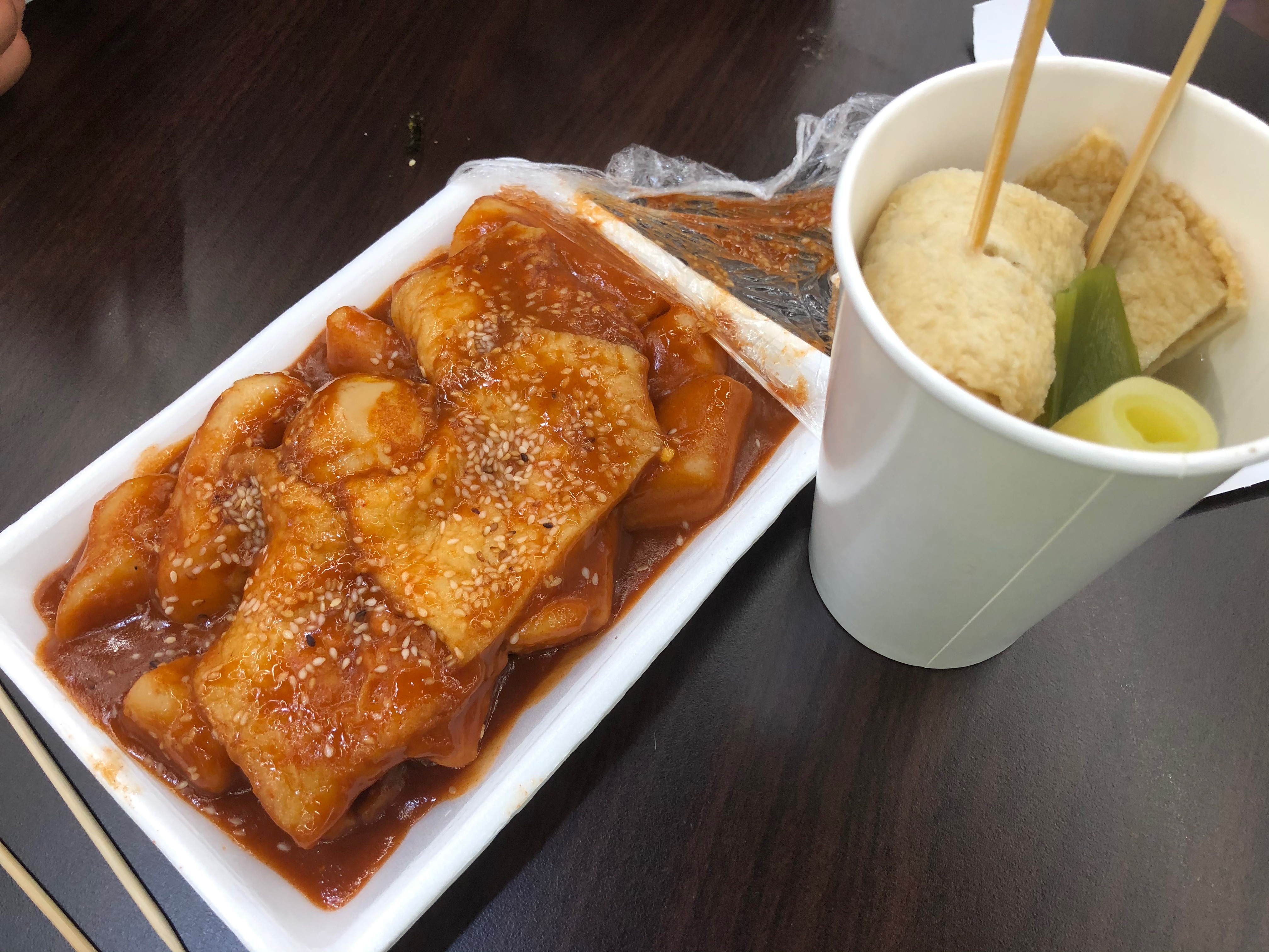 한국에서 먹는 떡볶이와 어묵과는 조금 차이가 있는 맛이다.