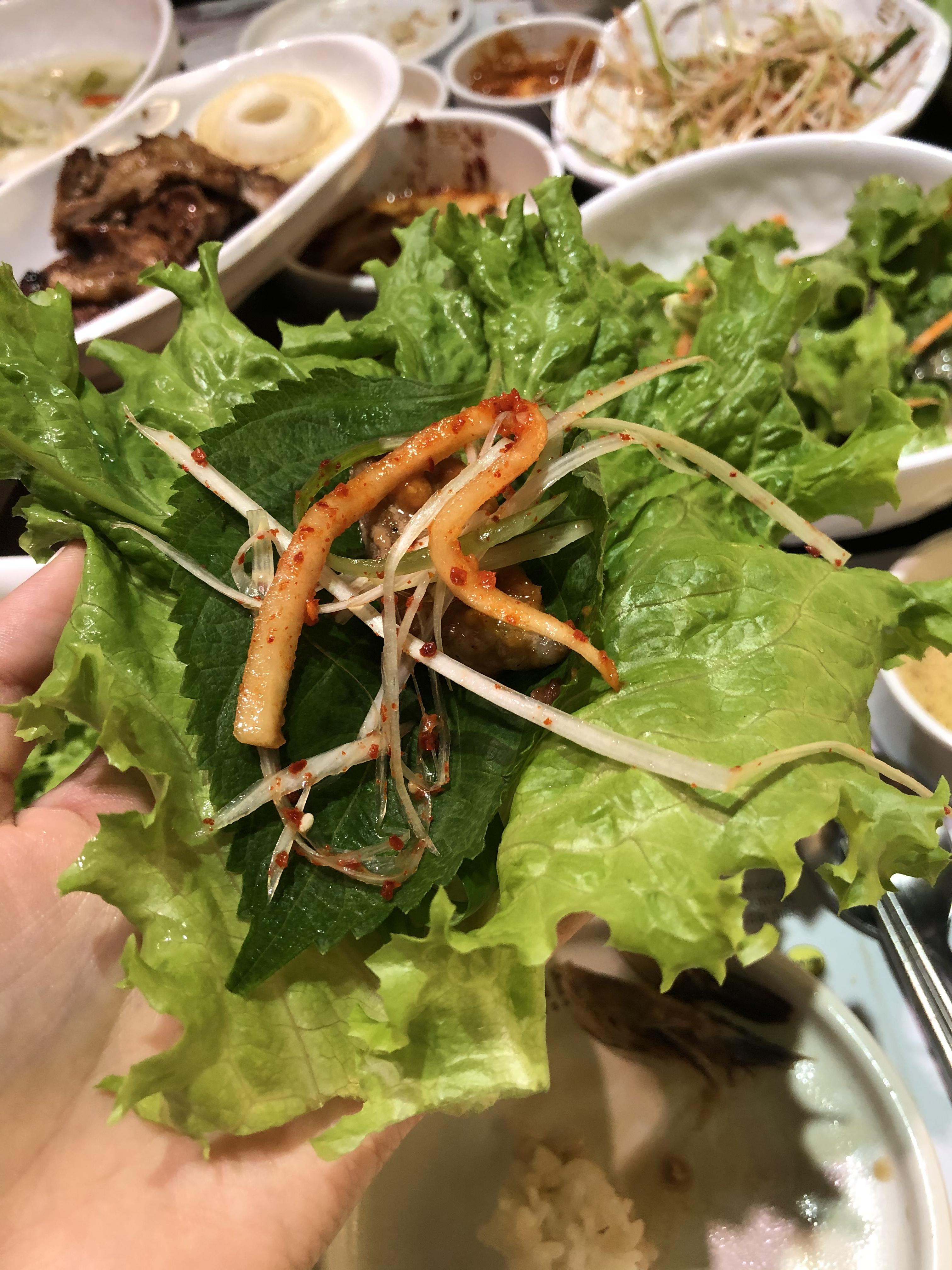 이렇게 풍성하게 쌈을 싸고 고기 두 점 정도 넣고 파절이, 무생채로 맛을 더해주면 이 한 쌈으로 모든 여행 피로가 풀리는 느낌이였다.