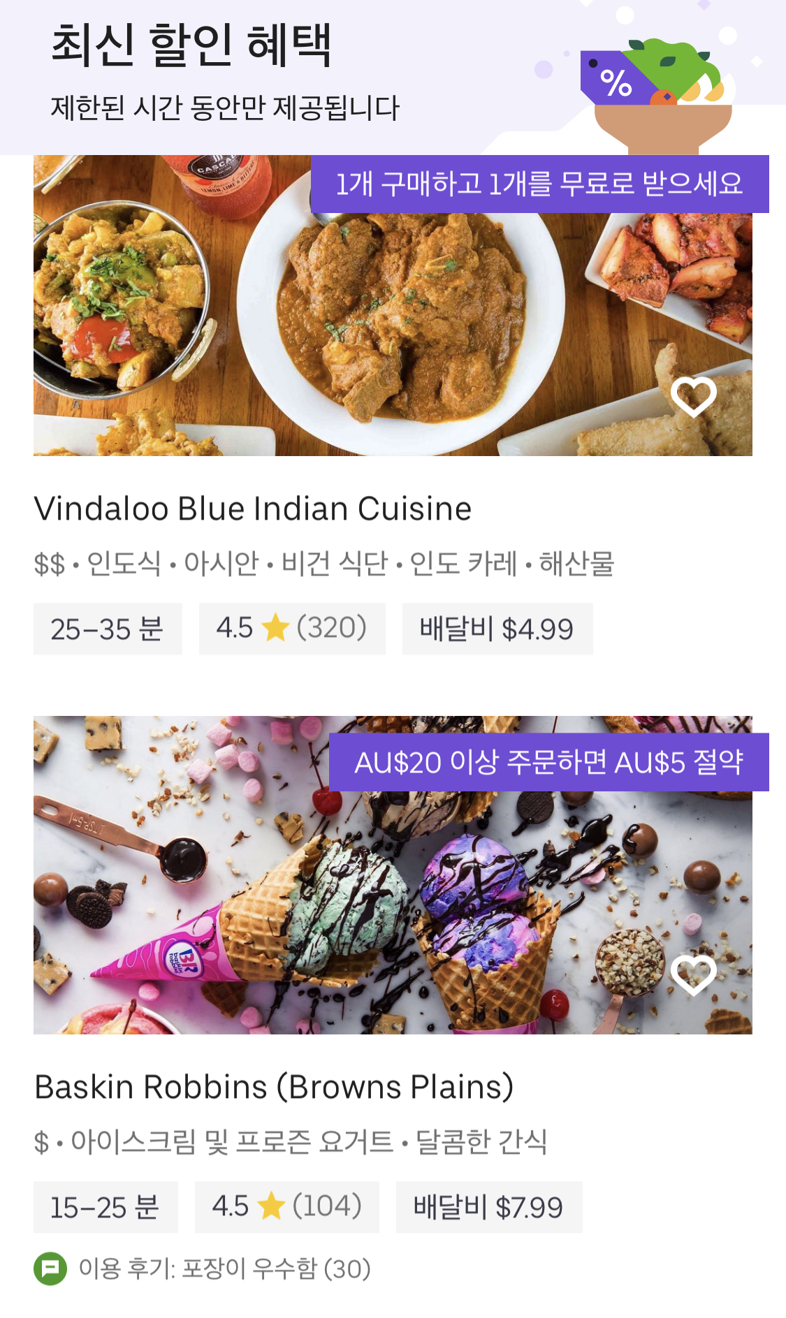 호주 문화 자체가 소비 문화 심리가 가능해서.. 정말 콜라 한 잔, 아이스크림 한 스쿱도 이렇게 배달 앱으로 이용할 수 있는 편이다.