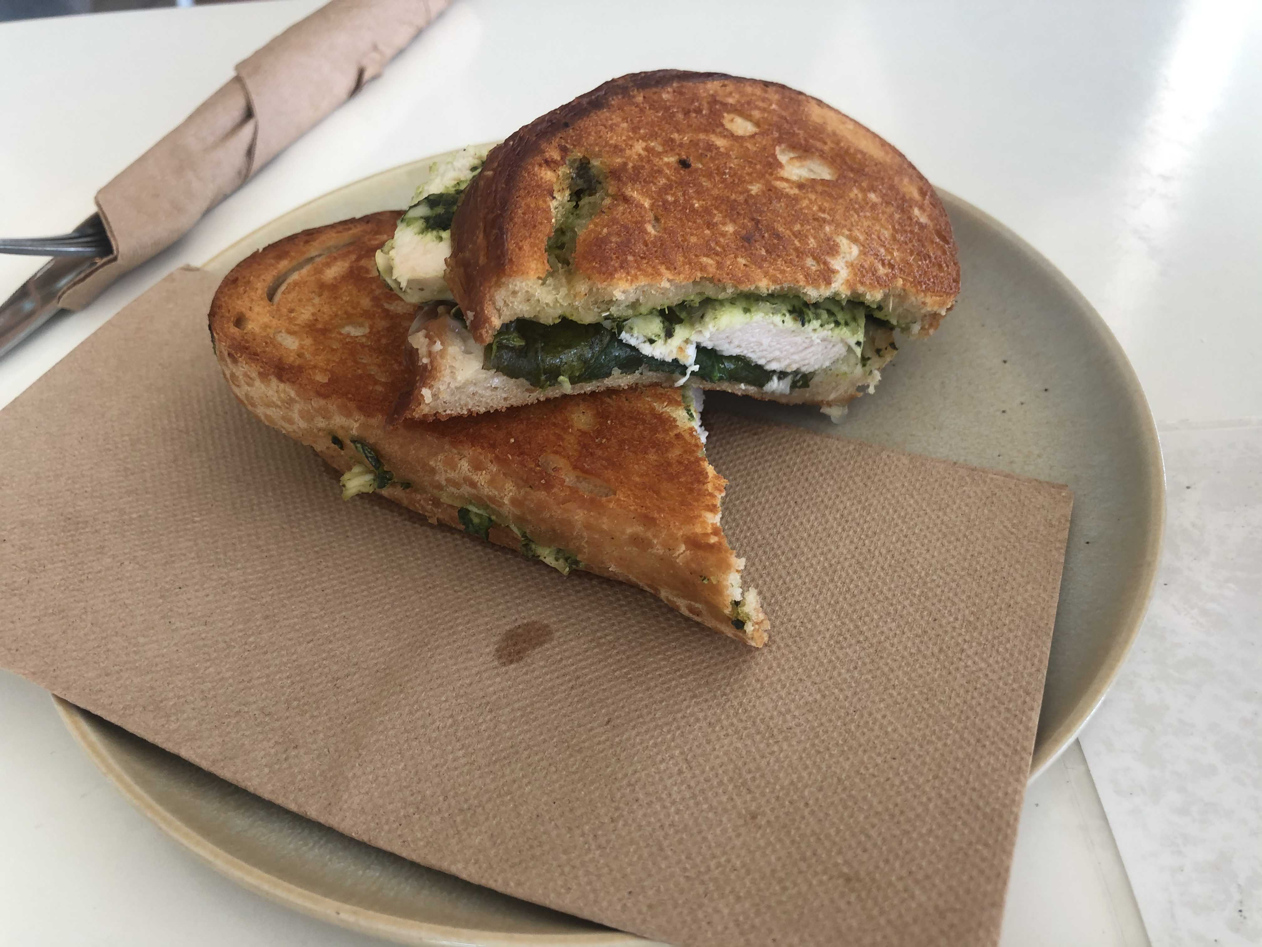 담백한 닭가슴살 + 시금치 + 페스토가 샌드위치로해서 나오는데 맛이 정직하게 맛있다.