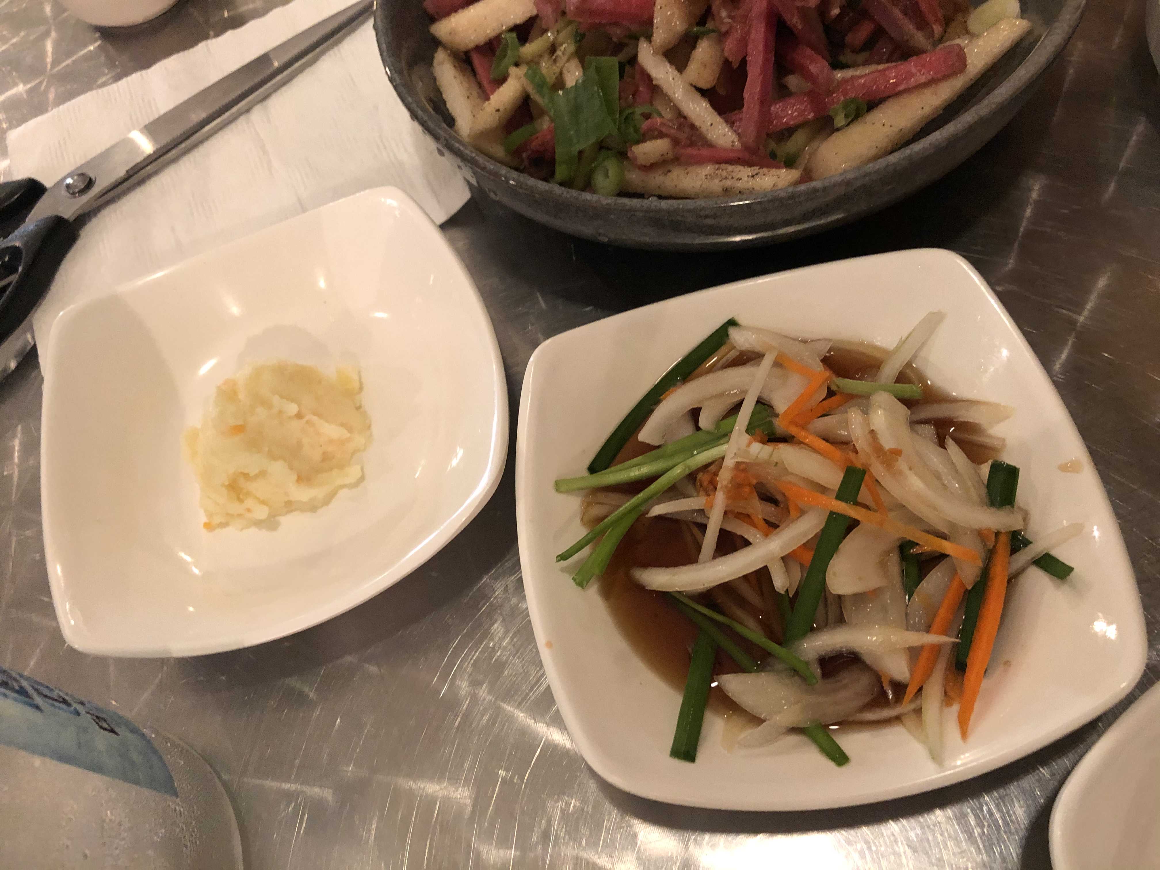 같이 나오는 반찬들. 감자 샐러드와 양파 샐러드? 양파 피클?이 함께 나왔다.