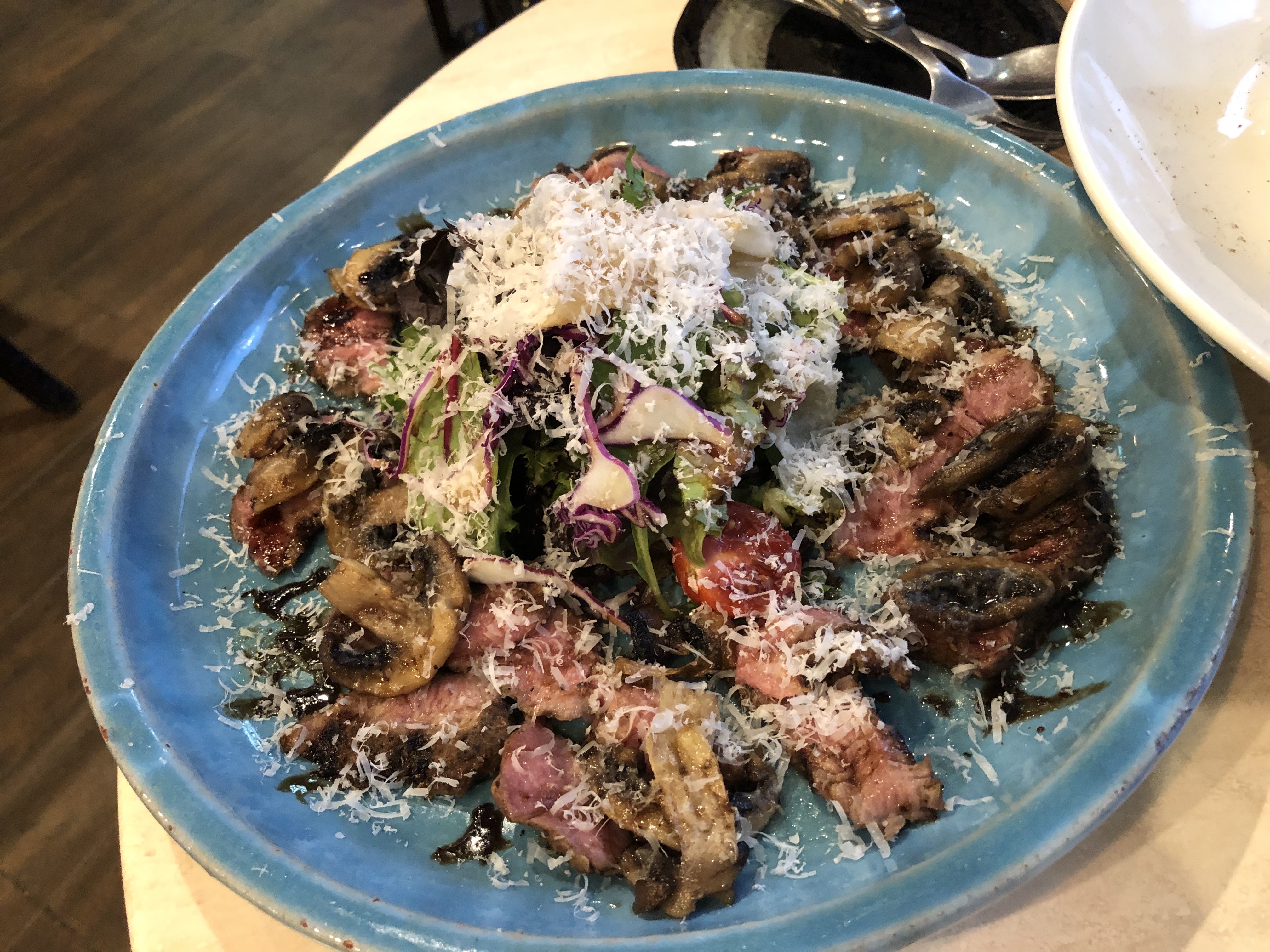 가장 맛있는 음식 두 개를 시켰다. 파란 접시에 있는 것은 소고기 타다끼이다. 소복하게 치즈도 올려줘서 맛있다.