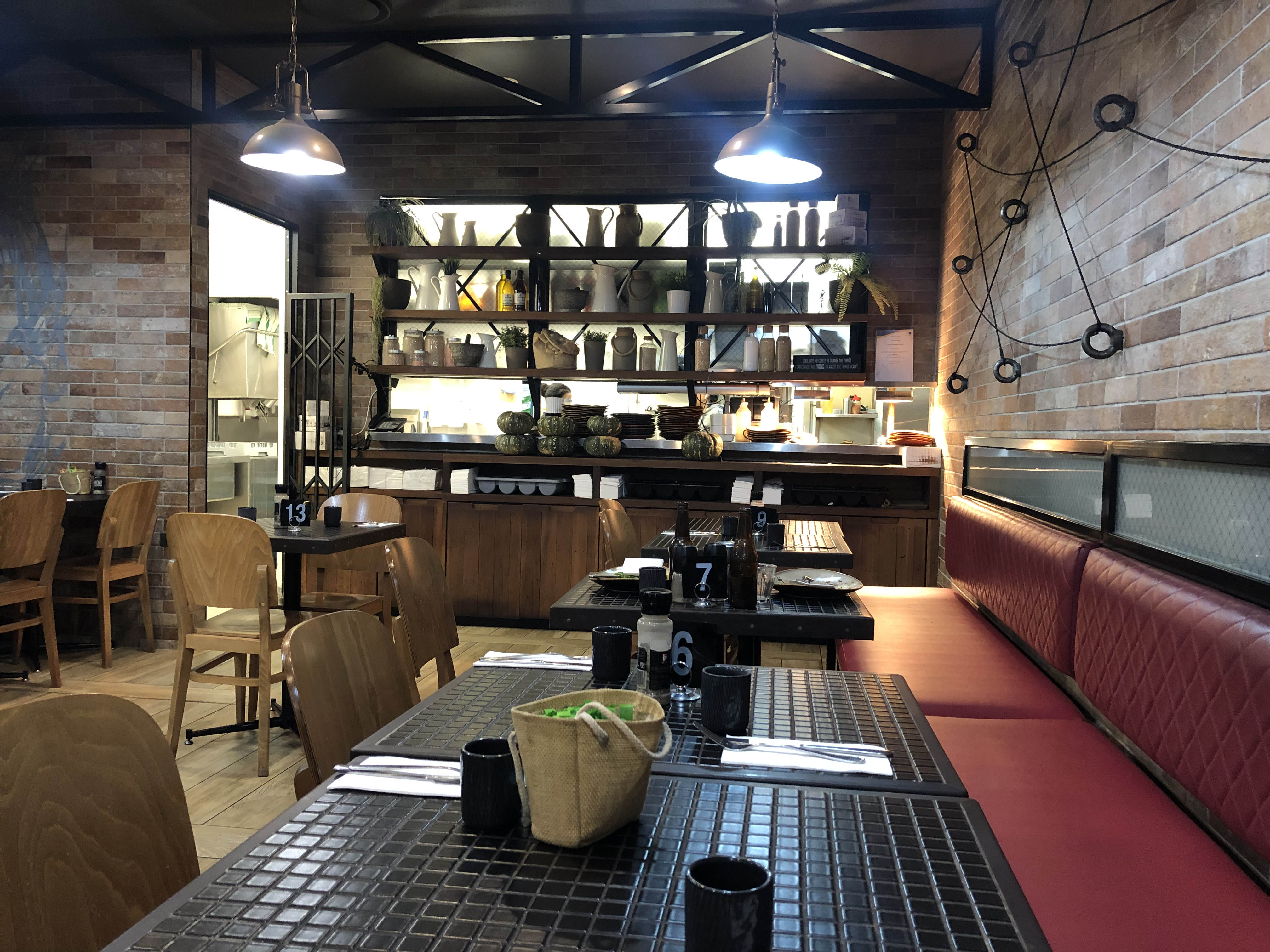 내부는 타일 모양의 테이블들이 있고 안 쪽으로는 절반짜리 오븐주방이 있다.