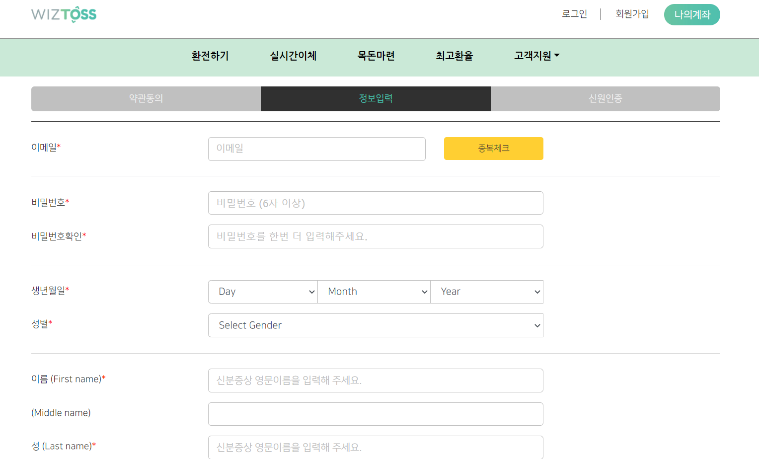 일반 홈페이지 회원가입 하듯이 빈칸을 전부 채우면 된다. 대신 주의할 점은 영문이름은 반드시 신분증상 (여권상) 영문이름과 일치해야한다. 아무래도 돈이 오고가는 거래가 있기 때문에 본인 확인이 철저하다.