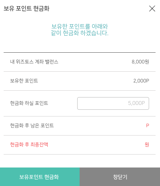 사실.. 포스팅하려고 한 번 이게 가능한가 해서 수수료 2000포인트를 남겨두고 8000P를 돈으로 바꿔봤는데 갑자기 위즈토스 계좌 밸런스에 8,000원이 들어와서 놀랐다.