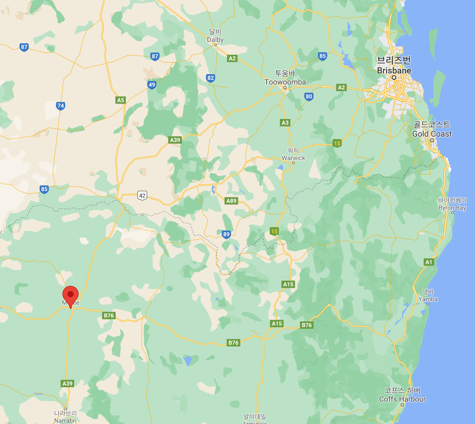 지도상에 중간쯤 있는 까만색 점선이 퀸즐랜드 주와 뉴사우스웨일즈 주의 경계이다. 경계를 지나서도 꽤 한참 내려가야 있는 곳이다. 가는 길이 재미있고 신선하지 않으니 꼭 좋은 노래 잔뜩 다운받아서 가야한다. 인터넷 안되는 곳도 아주아주 많은 편이다.