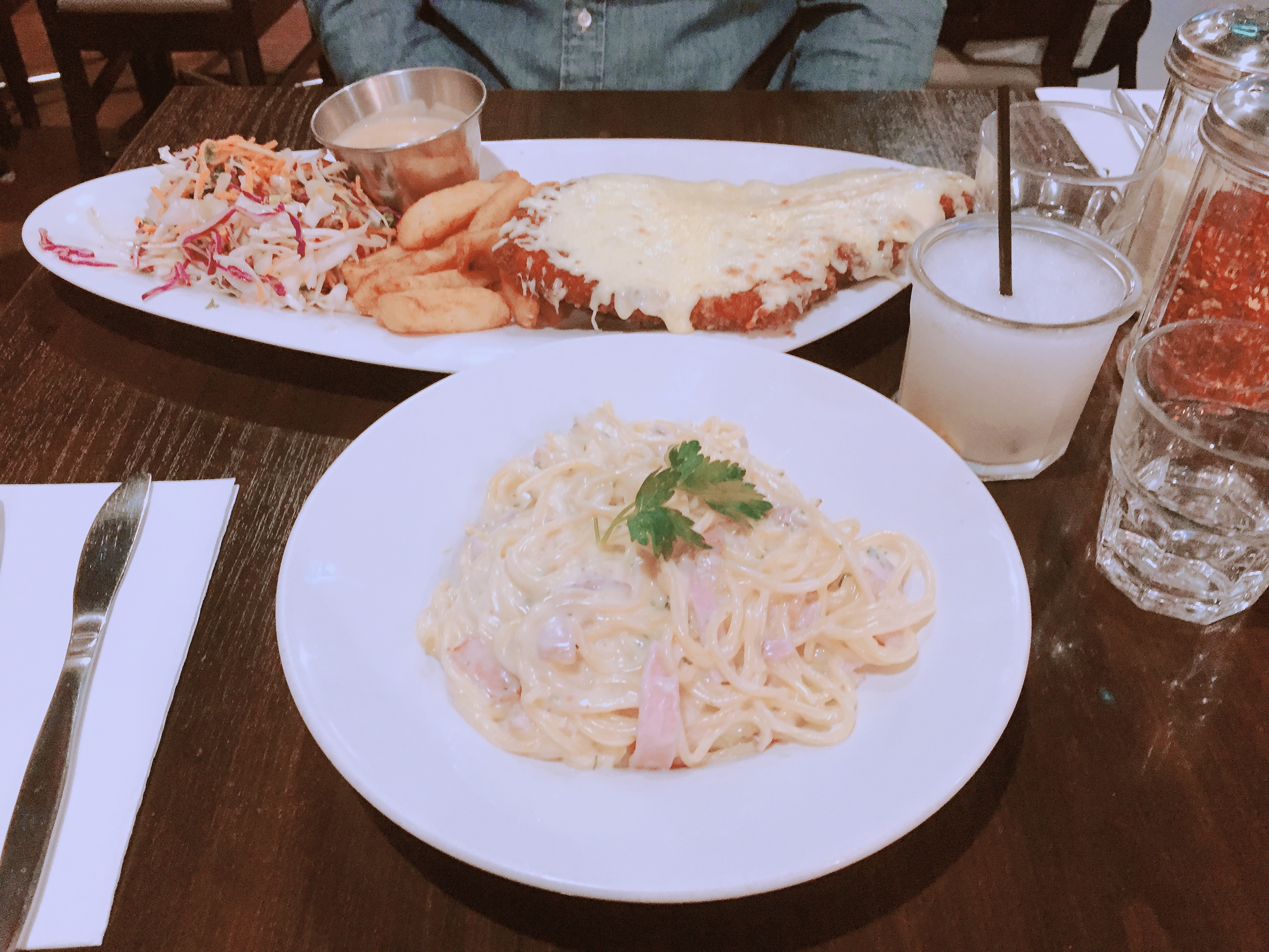 주요 메뉴는 까르보나라 크림 파스타와 치킨 스니츨!