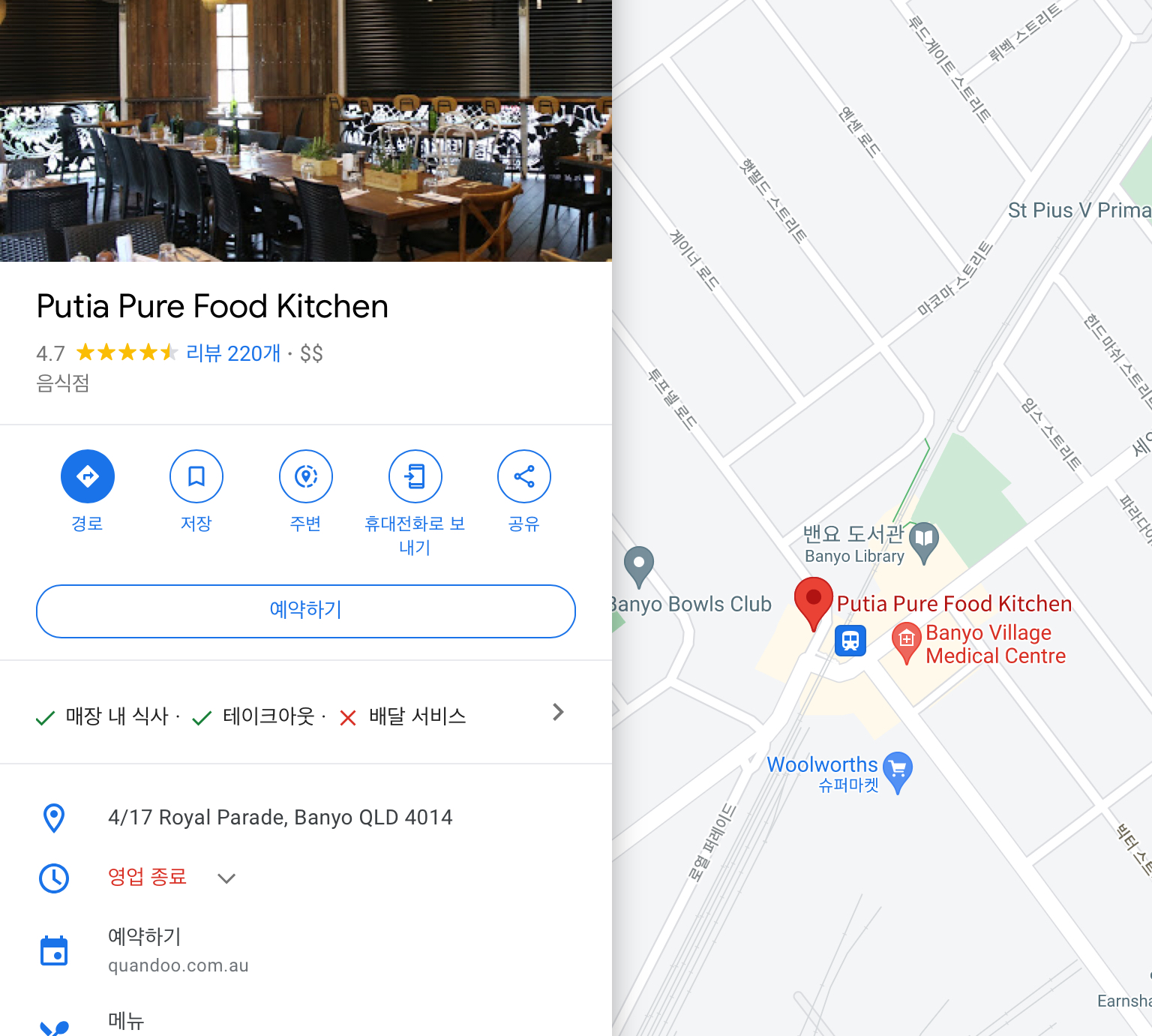 Nudgee 바로 근처에 있는 Banyo 라는 동네에 있다. 반요 스테이션 바로 앞 쪽에 있는 카페이다.