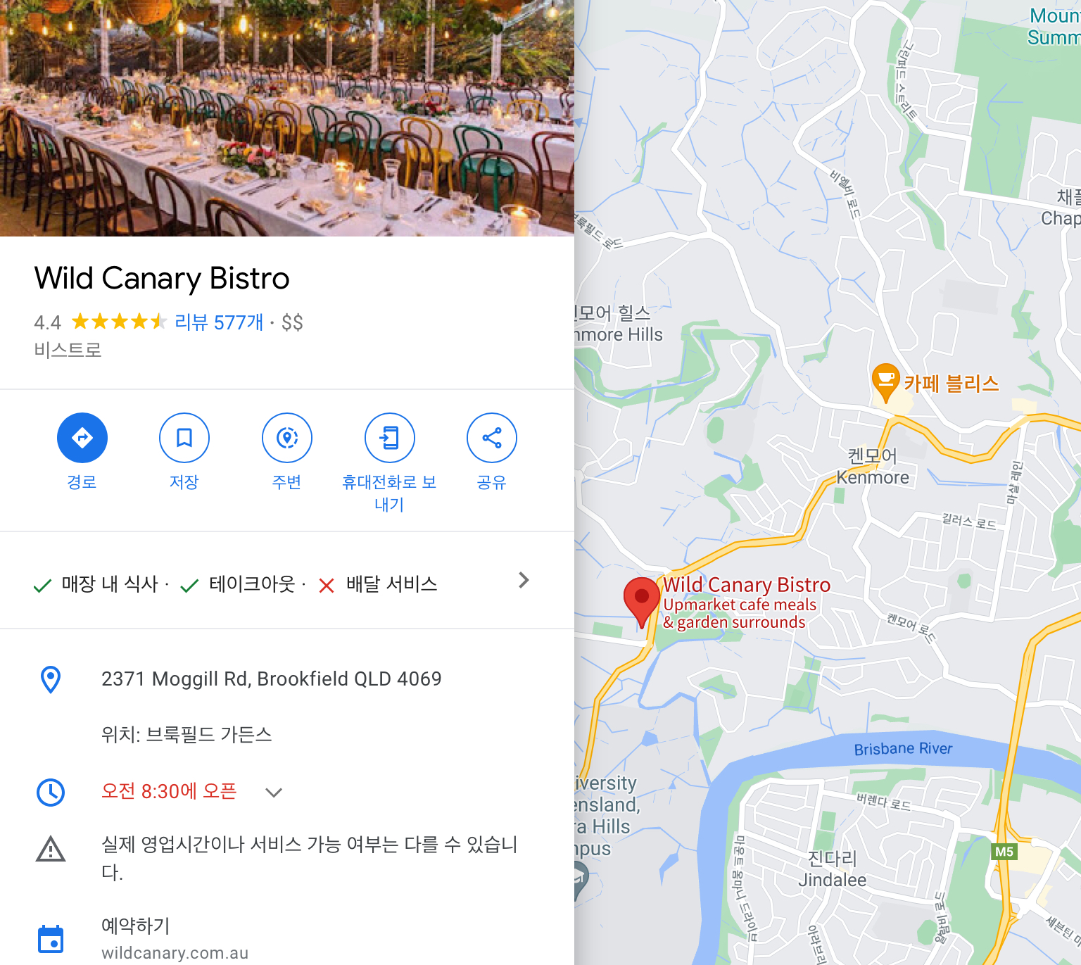 와일드 캐너리 위치이다. 강 위쪽이고 퀸즐랜드 대학교에서 그리 멀지 않은 곳이다.