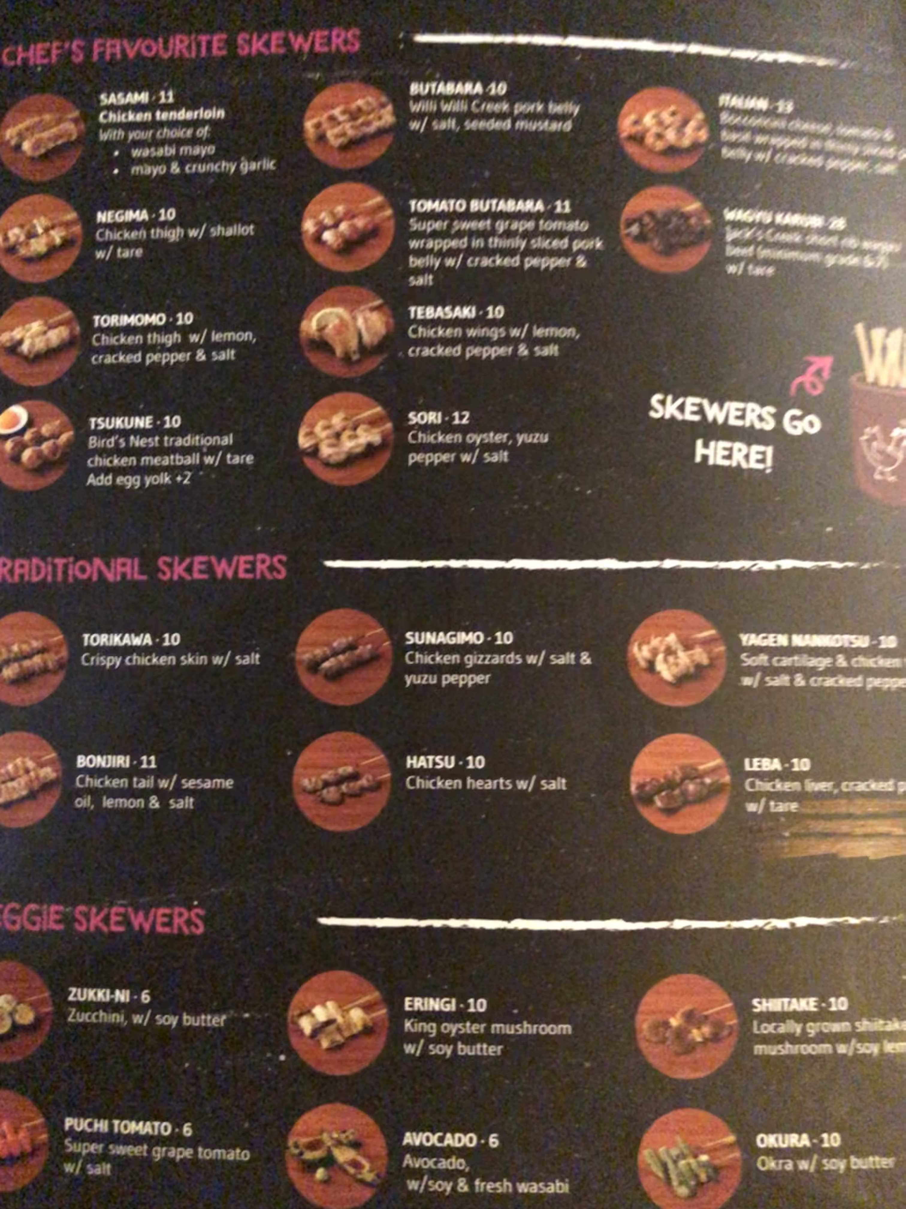 그 중 추천하는 메뉴는 TORIMOMO, TSUKUNE, BUTABARA, ITALIAN, WAYGU, HATSU, , SUNAGIMO, ZUKKI-NI, SHITAKE, ERINGI 정도 이다.