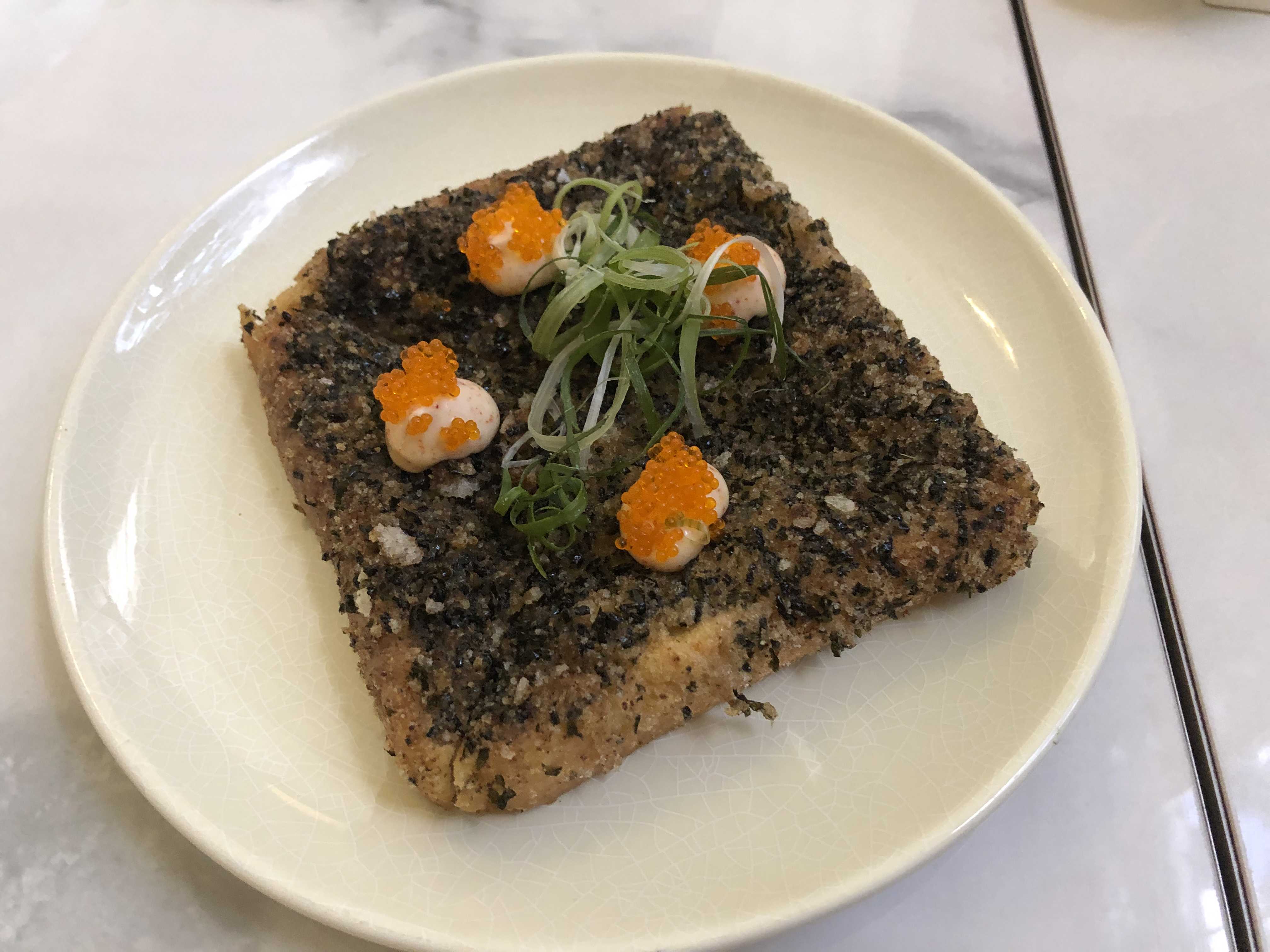 빵 안에 새우를 넣어서 튀기듯이 구운 스타일이다. 빵 위쪽에는 aioli 소스와 바삭한 김이 올라가있다.