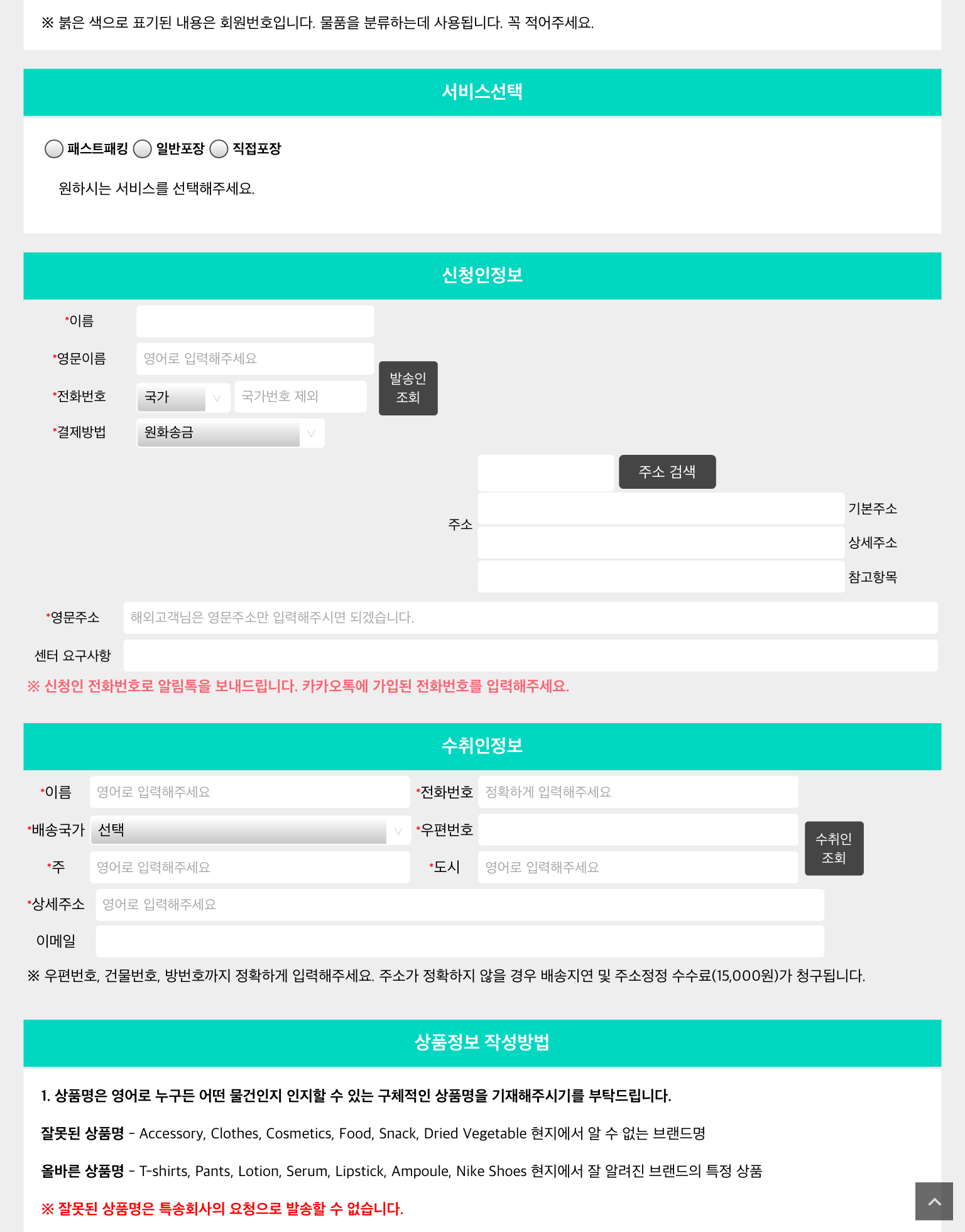 배송대행을 신청하는 주문서 화면이다.