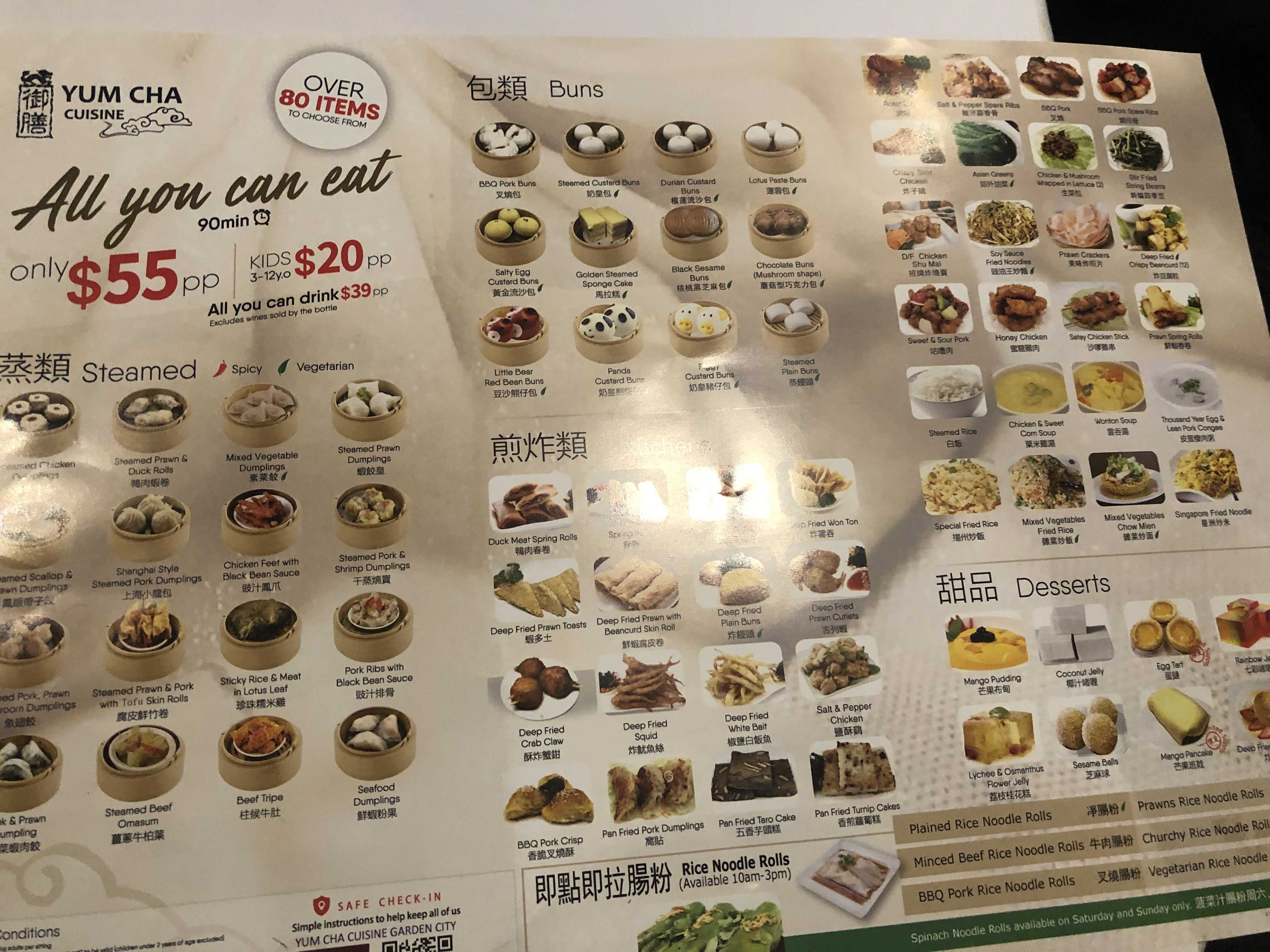 여기 얌차는 일인당 55불을 내고 무제한으로 1시간 반동안 먹을 수 있는 메뉴가 유명하다.