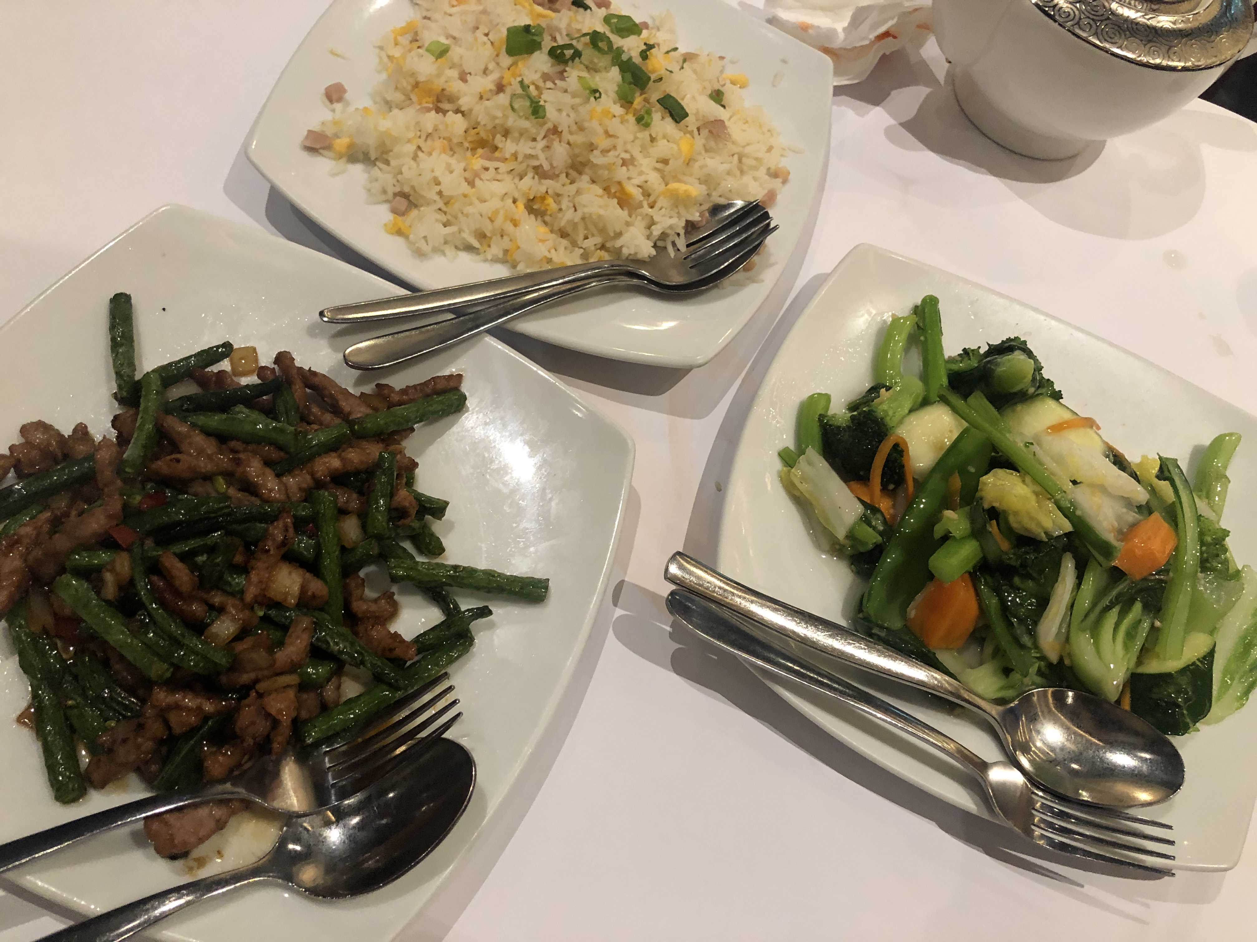 이어서 한꺼번에 나온 야채 볶음, 소고기 볶음, 볶음밥 3종 세트이다.