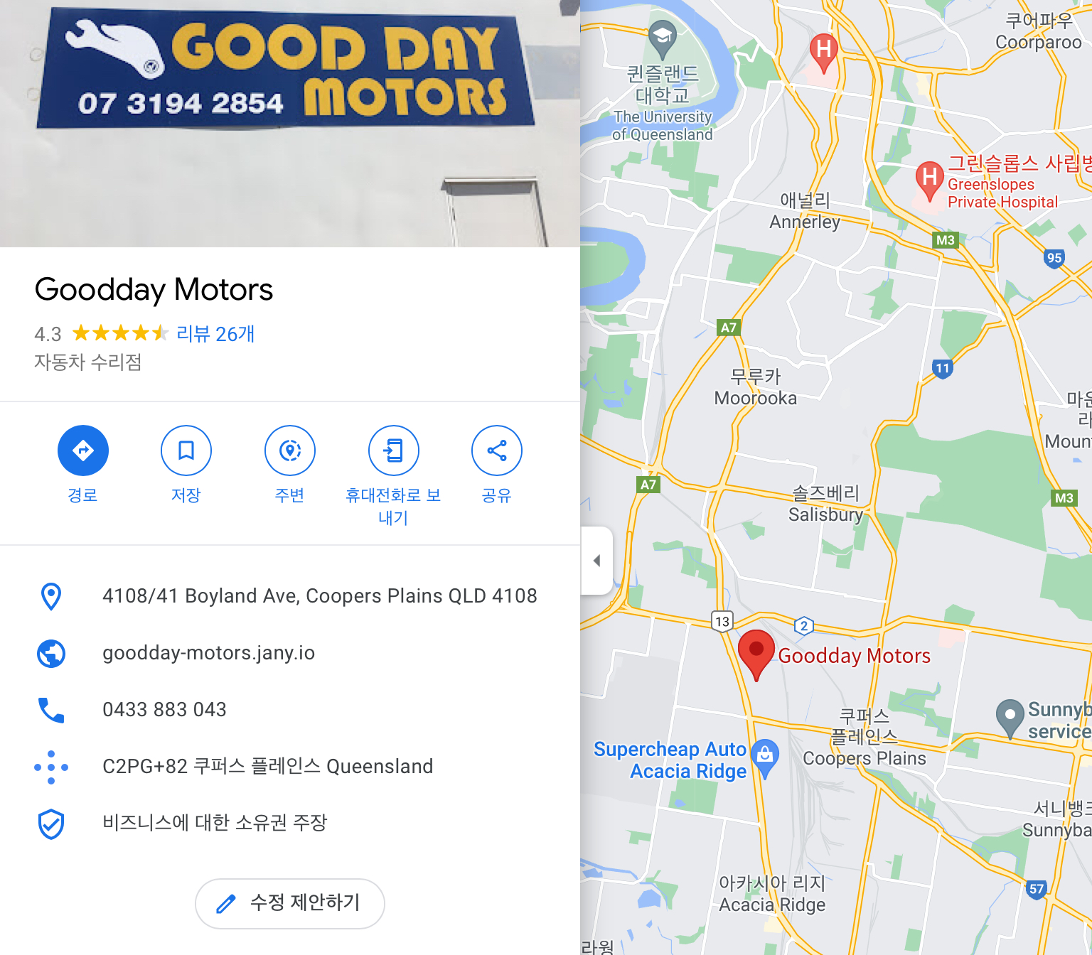 쿠퍼스 플레인스에 있는 굿데이 모터스라는 정비소이다.