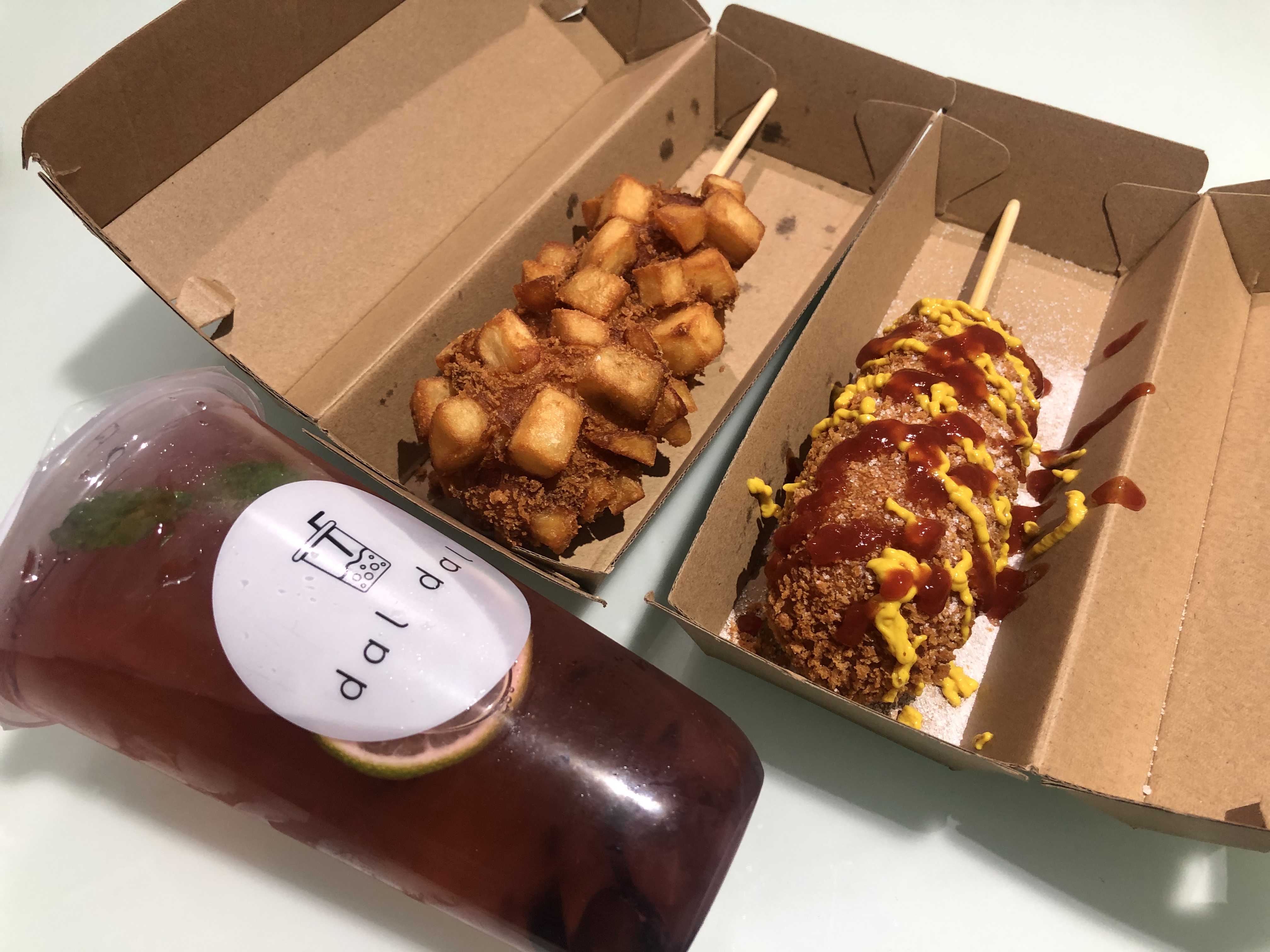 뭘 먹을까 고민하다가 포테이토 핫도그 하나랑 모짜렐라 치즈 이렇게 2개를 주문했다.