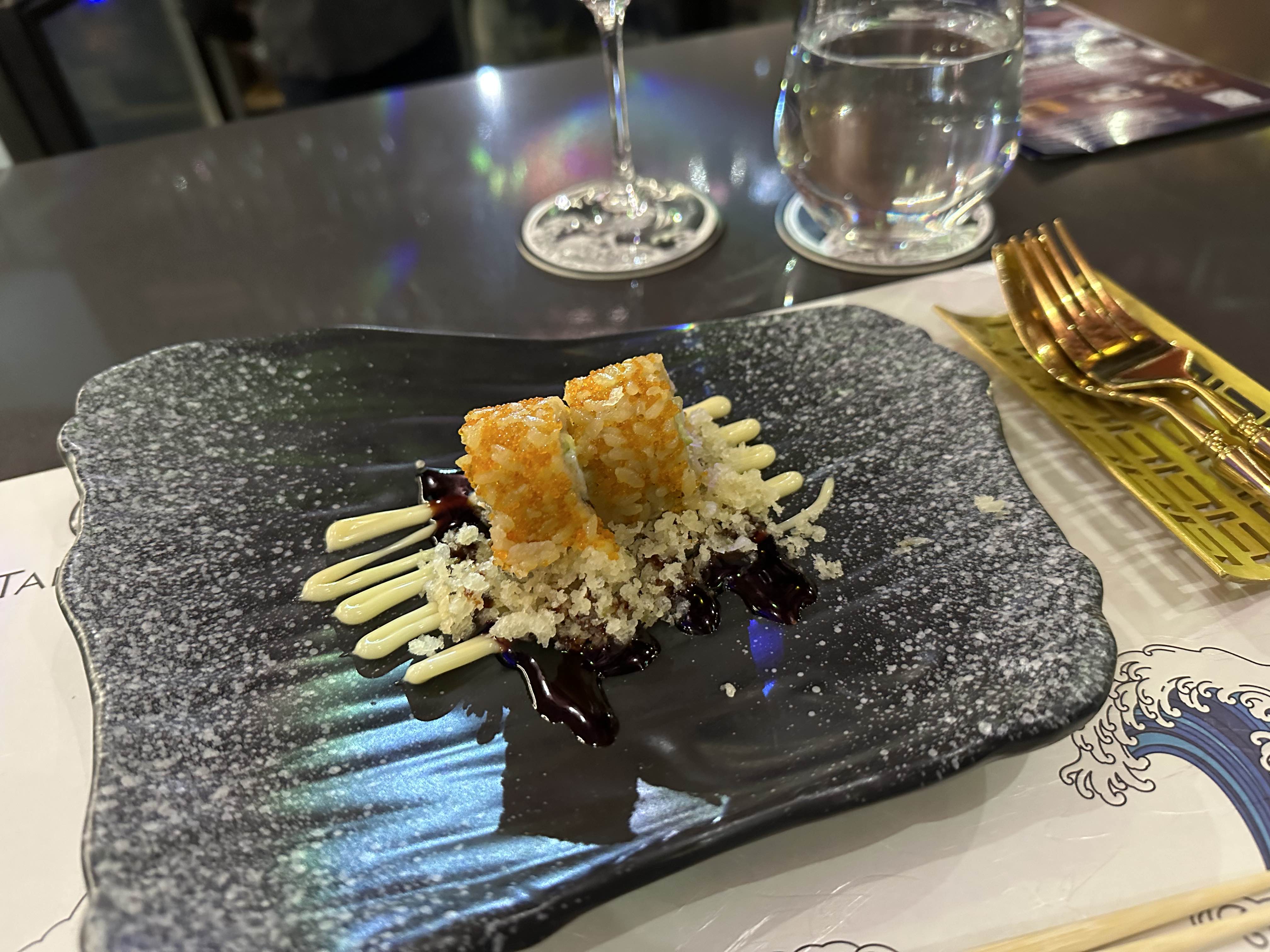 한 사람당 한 피스씩 나온다. 안 쪽에 있는 새우와 아보카도도 맛있었지만 밑에 크럼블들이 바삭바삭한 식감을 줘서 그게 아주 맛있었다 ㅎㅎ