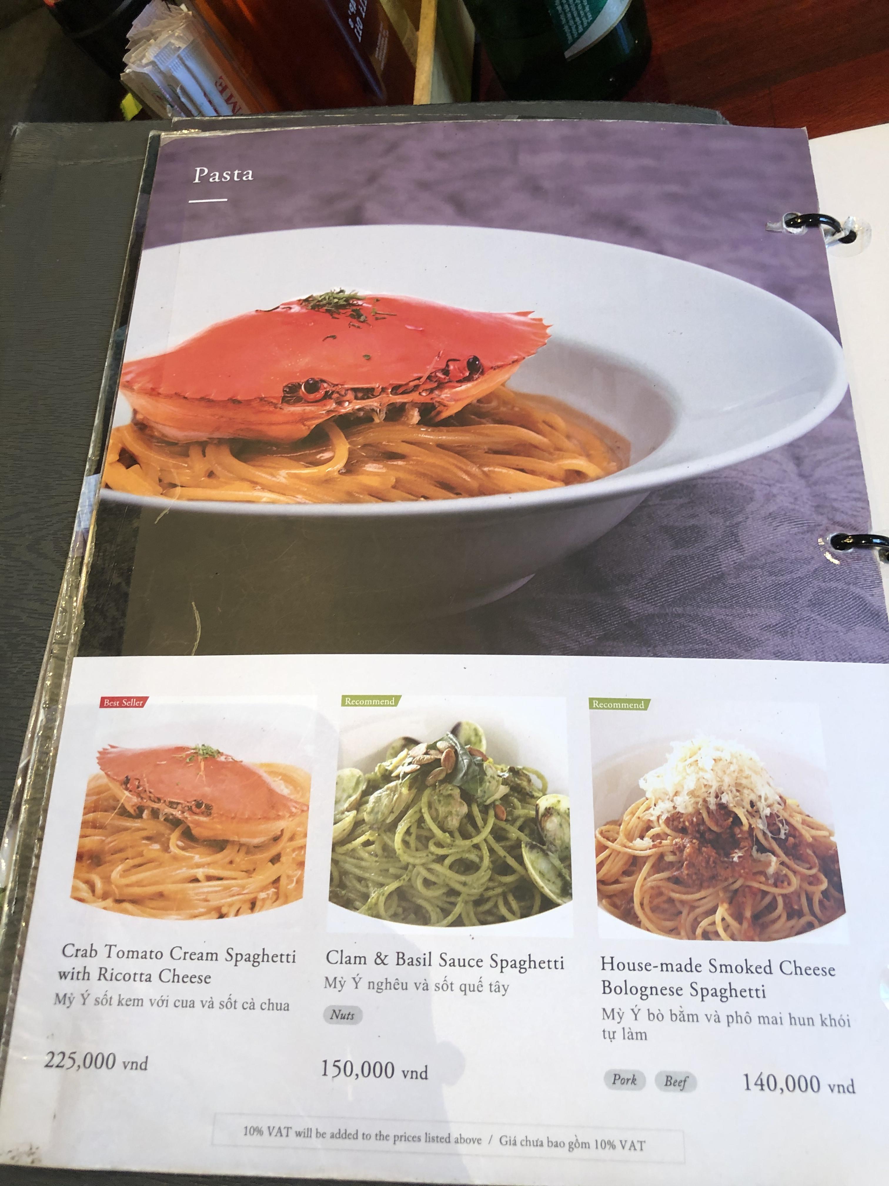 제일 유명한게 게살 크림 파스타 225,000동 짜리 인 것 같은데 어쩐지 볼로네제가 먹고 싶어서.. 140,000동 짜리 볼로네제 파스타를 시켰다.