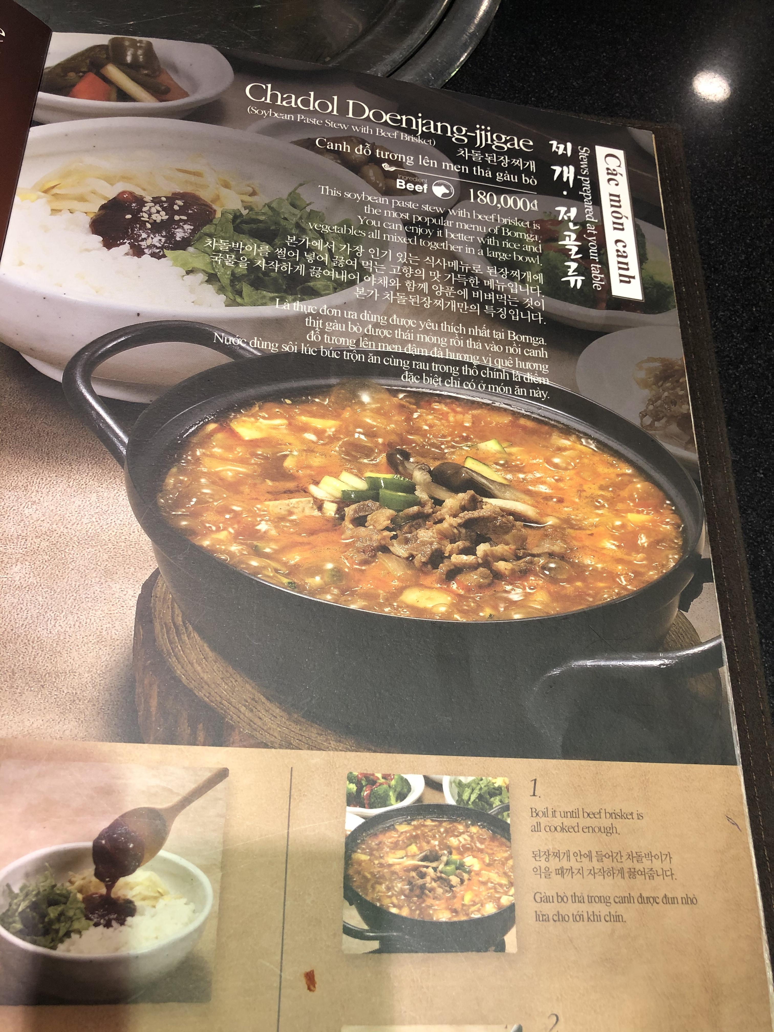 차돌박이 된장찌개의 가격은 18만동이다. 한화로는 약 9천원!
