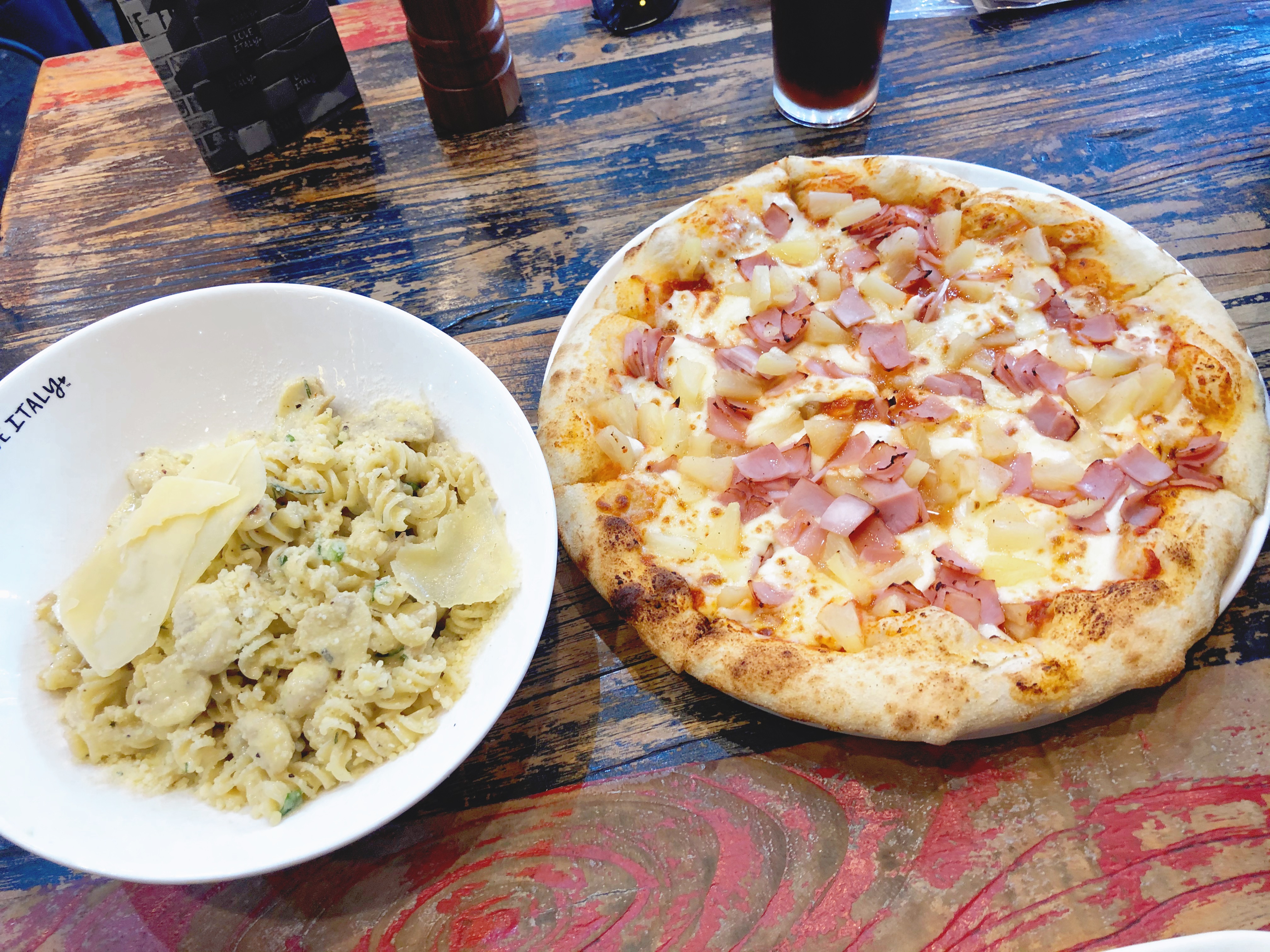 왼쪽이 푸실리 펀기 파스타, 오른쪽이 하와이 피자이다.