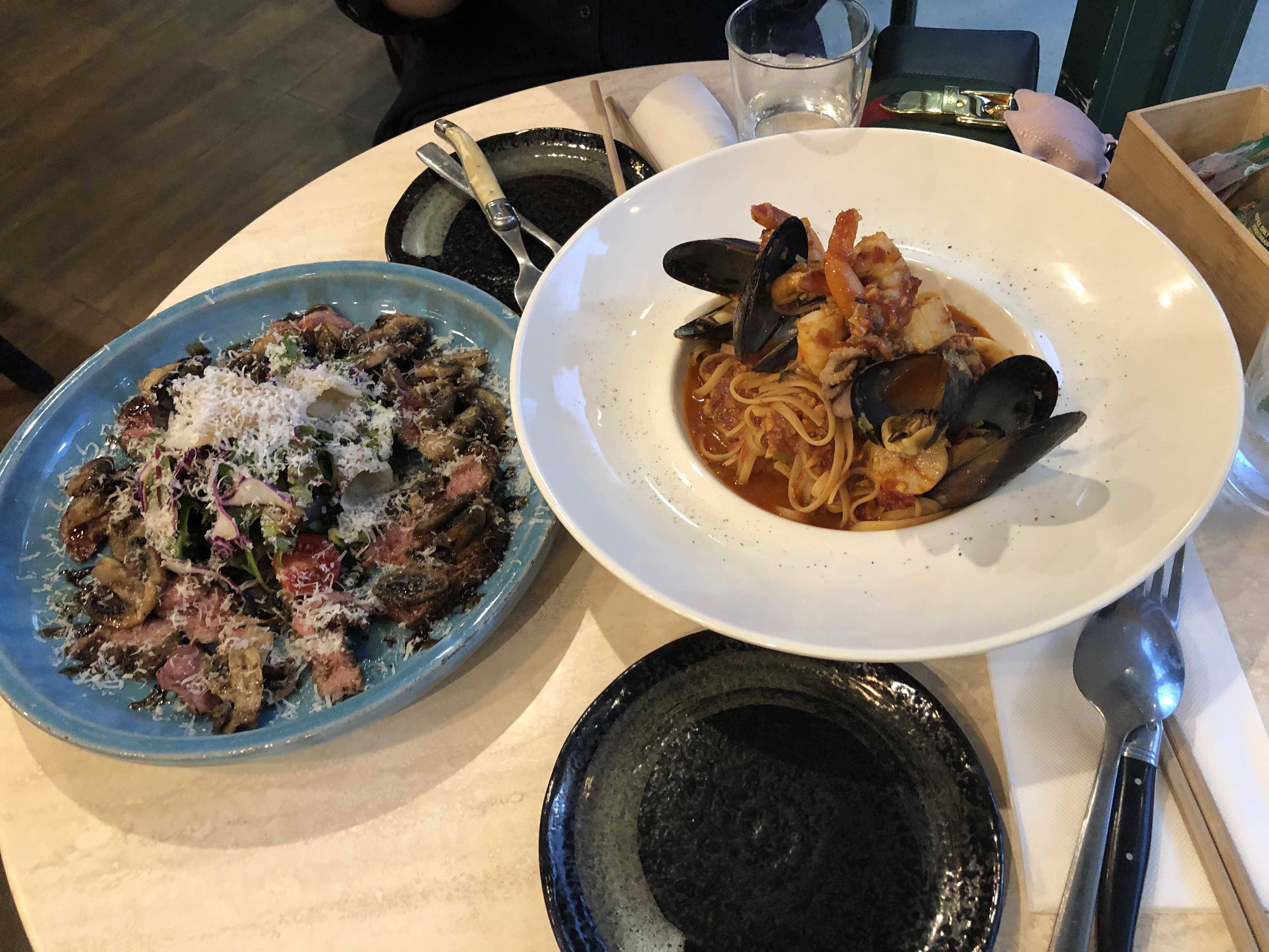 그리고 오른쪽에 있는 것은 씨푸드 파스타이다! 해물도 그득하게 올려주시고 기본에 충실한데.. 이상하게 자꾸 생각나는 그런 파스타이다. 먹을 땐 막상 맛있게 먹느라 뭐 때문에 더 특별한지 잘 모르겠다.