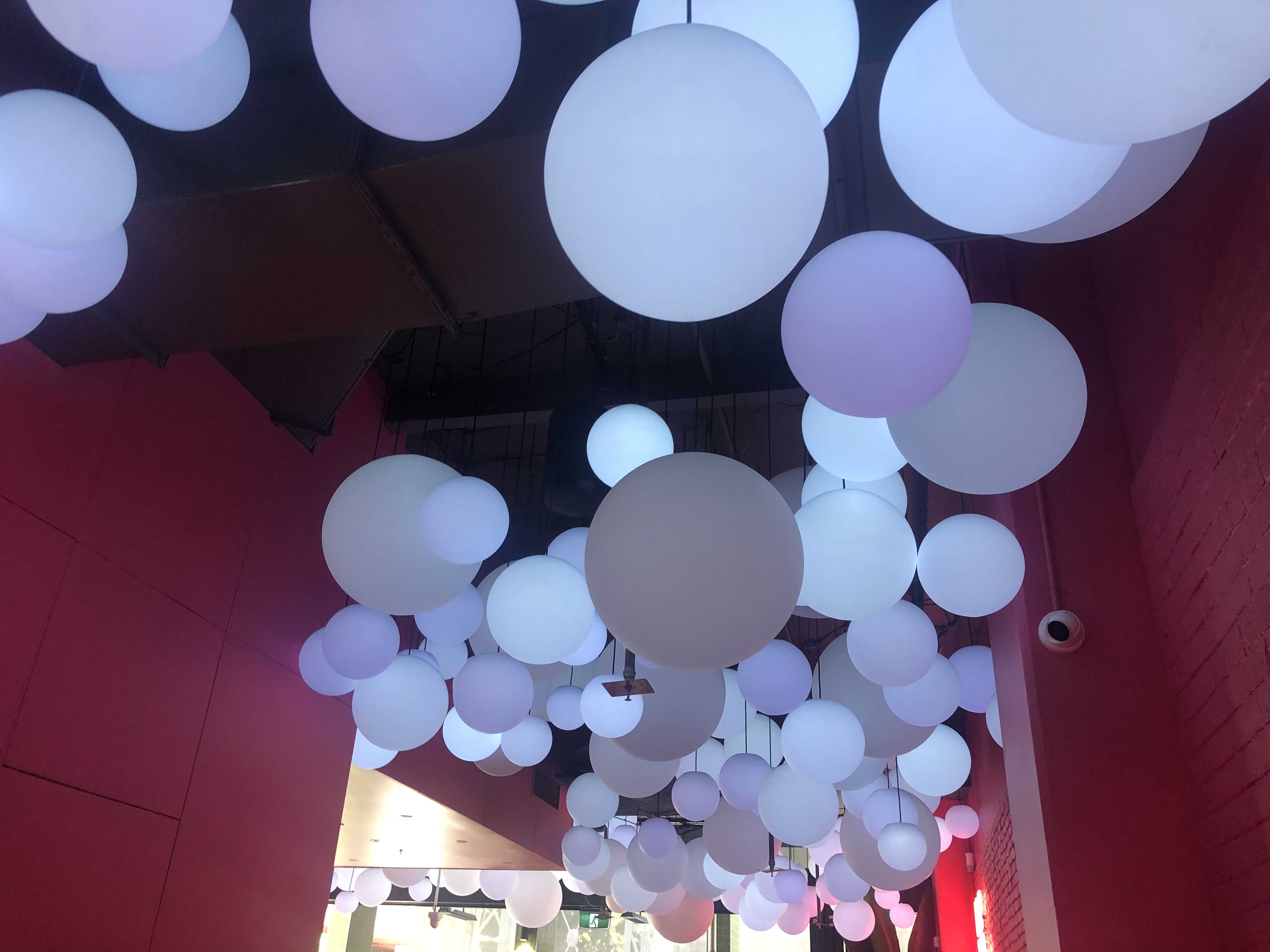 멀리서 봤을 때는 그냥 분홍색 가게인지 알았는데 밥먹는 곳 위쪽이 동그라미로 가득차있었다.